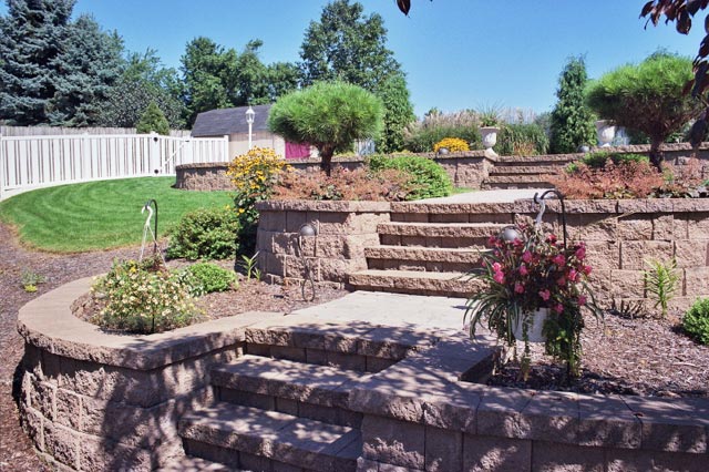 Kadryna’s plan called for terracing the large patio area around the pool, using three different strata of retaining walls, connected with walkways and steps. Walls were from 24" to 48" high depending upon where they were located on the slope. Steps were integral to the structure of the walls, using wall blocks for risers and wall caps for treads.